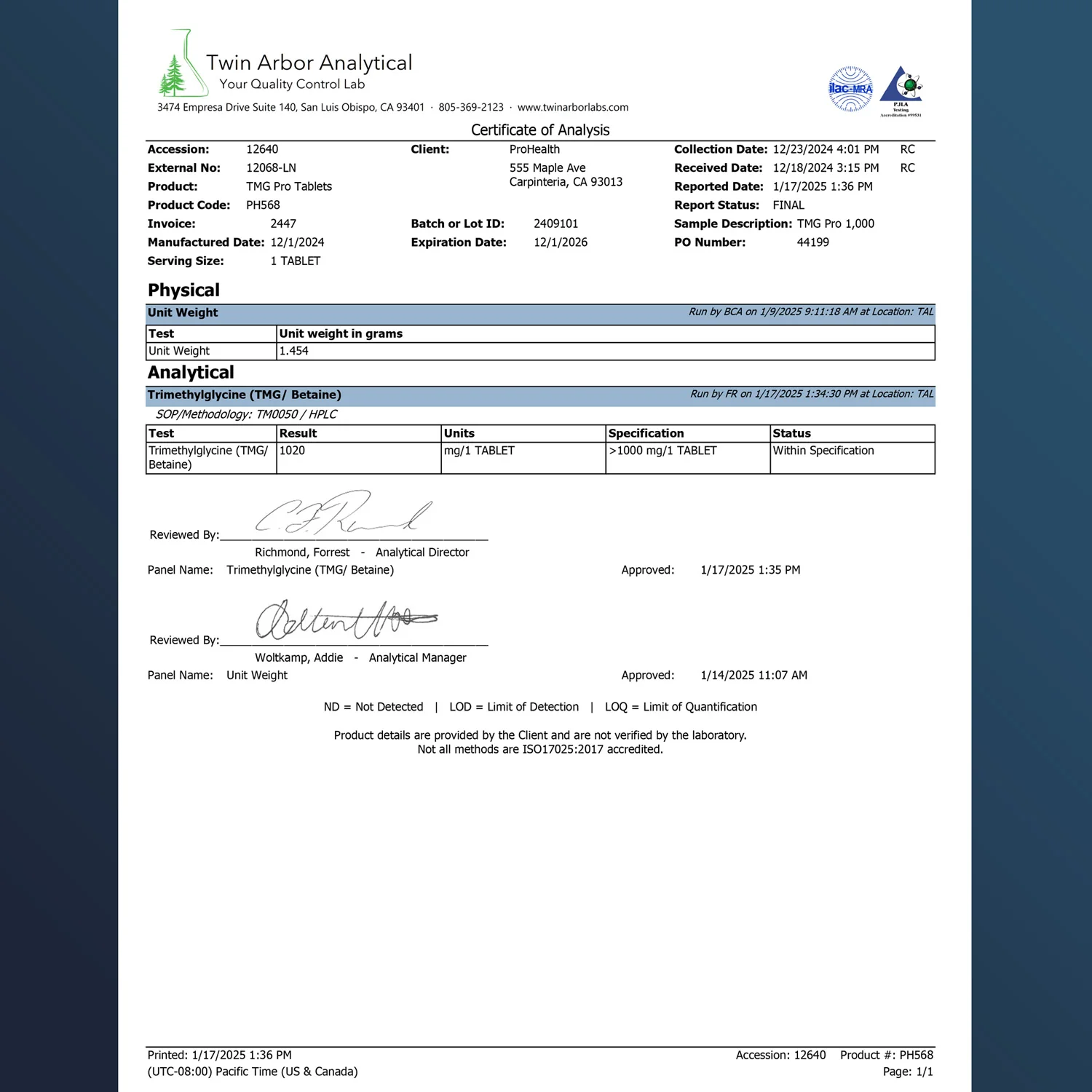 Higher Dose. ProHealth’s TMG Pro contains 1,000 mg of TMG as Betaine Anhydrous, whereas other TMG supplements may contain just 750 mg.